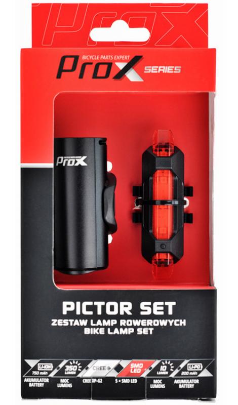 Opis: Zestaw lamp marki Prox o lampie przedniej o mocy 350 Lm i baterii o pojemności 750 mAh oraz tylnej o mocy 10 Lm i baterii 200 mAh